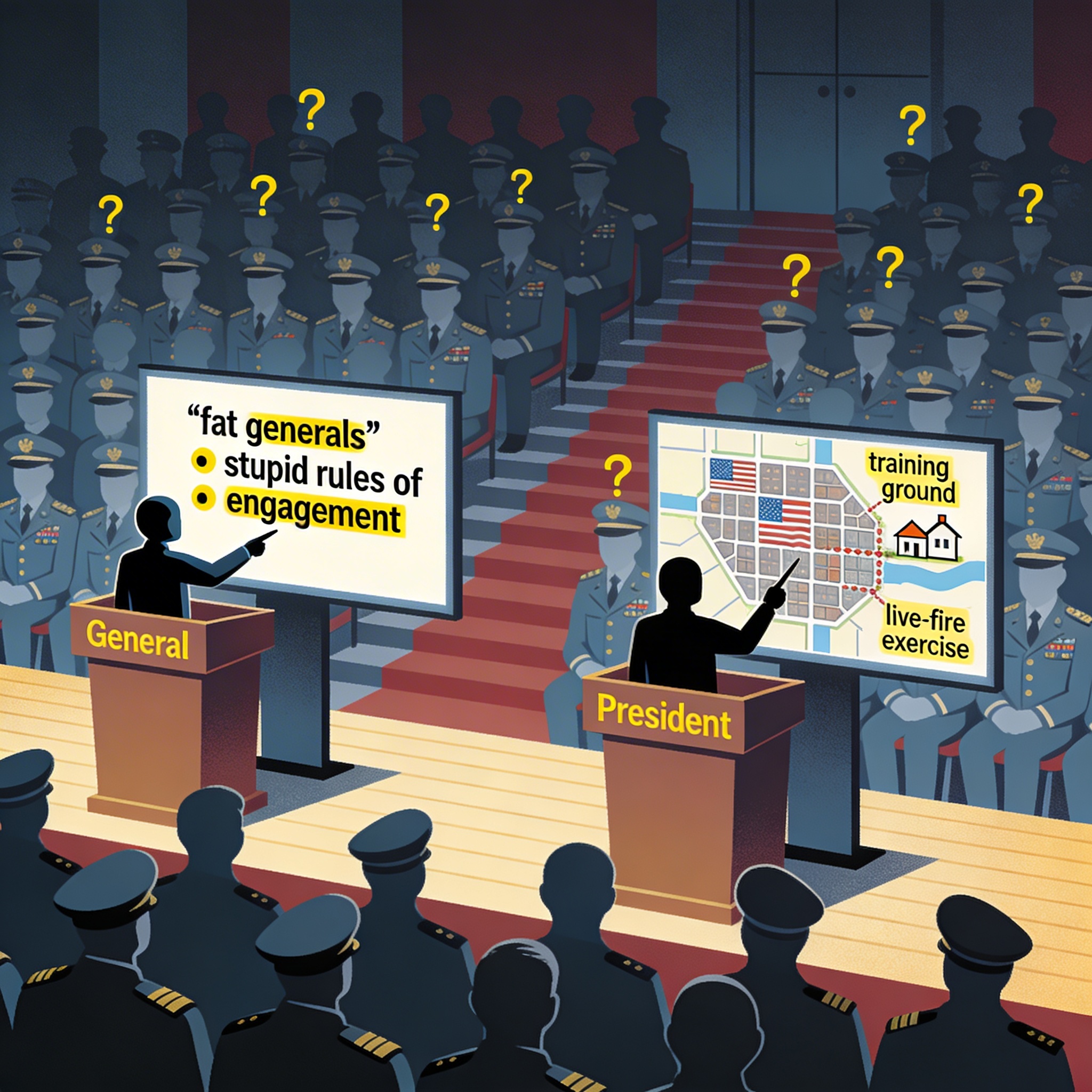 Figure 1.4: ‘Fat generals’ confronted with two competing visions—one deriding its own command, the other repurposing the nation as a firing range—producing a tableau of disciplined confusion